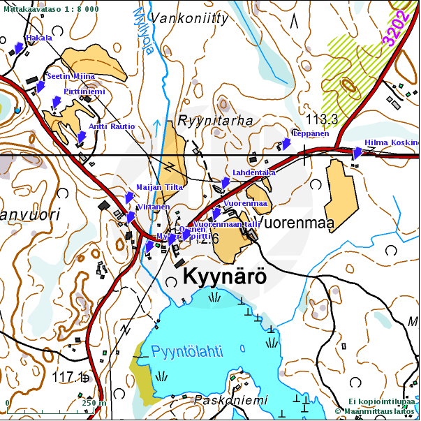 Padankoskelle päin ei tainnu olla portteja olleskaan siinä tiessä. Että ne oli taas noinkun tien sivusta lähti meneen, niinku Palkkimettään päin, ja olikohan siinä kun Pietilään mentiin, siinäkään ei tainnu olla porttia. Mutta siinä oli kun käännyttiin, missä nyt oli se Laineen asunto, käännyttiin sinne vasemmalle Kyynärölle päin, se oli kai elukoita varten, se oli melko lailla kauan muistaakseni.