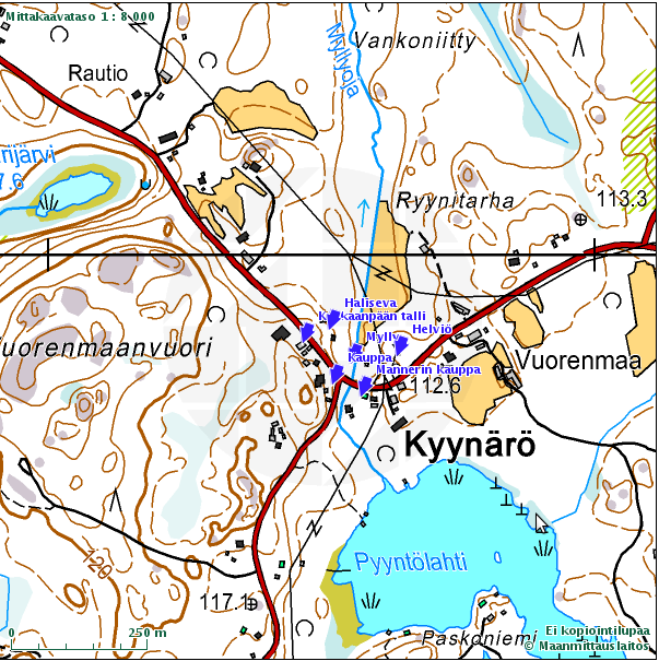 Padankoskella päin oli se Lemposkan mäki, se oli se Lemposkan mökki siinä ojan kulmassa. Ja Lemposkan navetta oli sillä kohtaa, missä oli kauppiaitten varasto. Ja sitte oli se mitä me nimitettiin Myllärinmäeksi, jota nykyään nimitetään Sepän mäeksi, sehän muutti nimensä heti kun seppä tuli. Sitte oli se Ropakonmäki pikkusen matkaa siitä (nykyisestä) Tulokkaan Erkin asunnosta eteenpäin. Ja niin, sittehä siinä oli sellasta ylämaata, missä oli Laineen asuntoki, Mäkipään Iita asu siinä niillä reunoilla justiin. Siinä Ropakonmäen seutuvilla oli se semmonen kallio sitte, missä pidettiin noita tulia, siinä oli piirileikkejä. Vähä kauempana oli Kitakallio, se oli sie Pietilän kohdalla: minä en muista olinko kertaakaan siellä Kitakalliolla, et se oli niinku menny jo muodista pois.